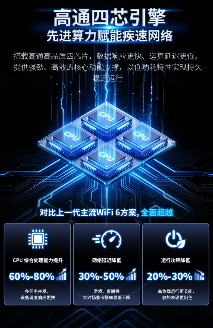 强芯片决定好品质,CF-WR673BE搭载高通高品质四芯片,全方位提升设备的综合运行效率与数据处理能力,为网络连接提供强大且可靠的算力支撑。
