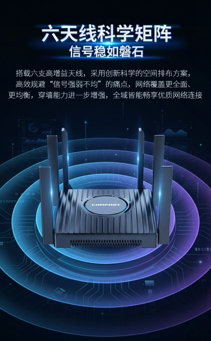 CF-WR673BE搭载六支高增益天线,创新科学的矩阵排布,有效增强网络信号的抗干扰能力,减少穿墙过程中带来的信号损耗,让网络连接更随心自在,满格信号不掉线!