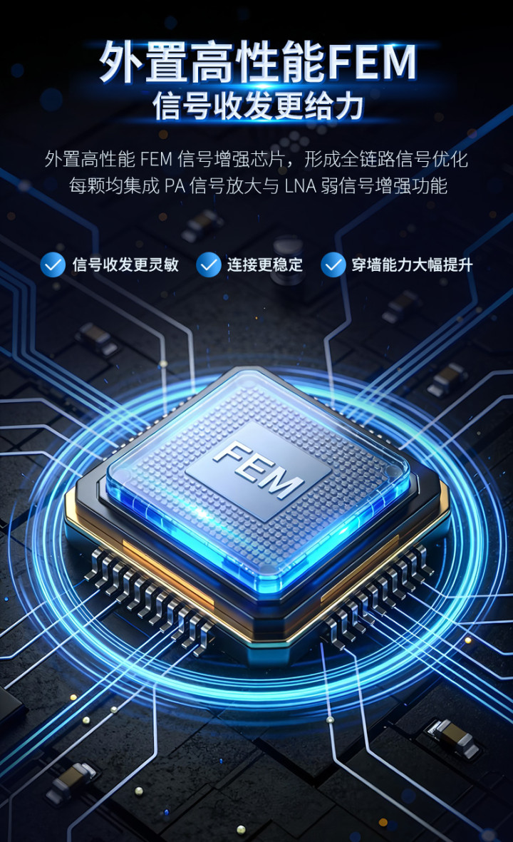 外置多颗高性能FEM,每颗均集成信号放大与弱信号增强功能,带来更强劲、更灵敏的网络连接,轻松告别“卡顿”焦虑,信号收发更给力!