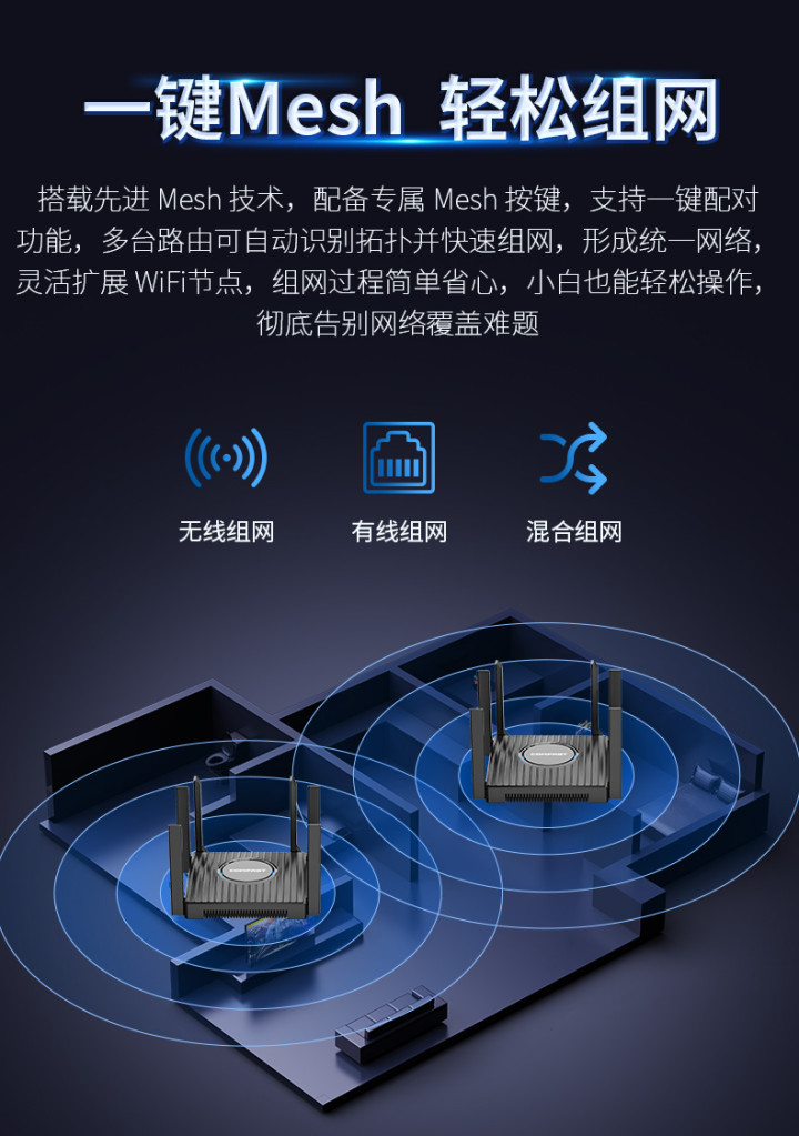 CF-WR673BE 支持MESH组网技术,配备MESH按键,可与多台MESH路由一键组网。
